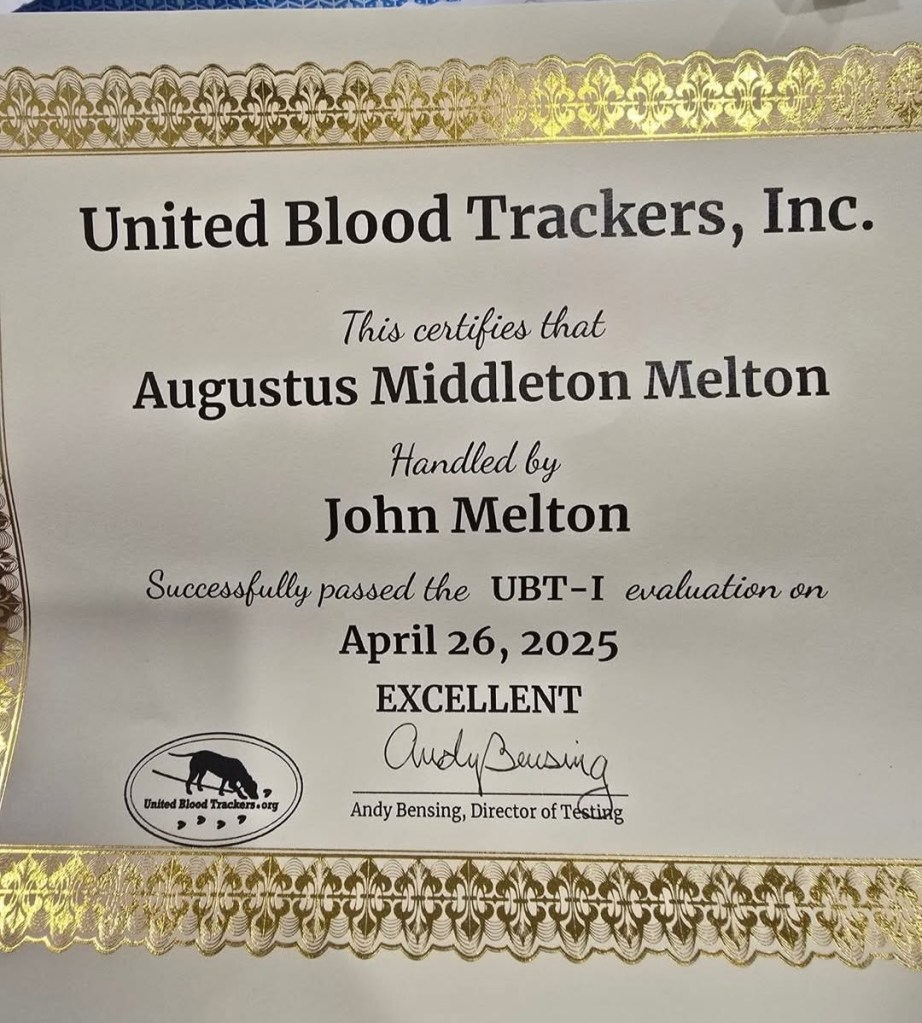 Meet Gus, a highly trained bloodhound with a nose for success. Bred from a world-class lineage of tracking dogs and trained by a leading expert in the field, Gus has earned the prestigious Level 2/Seasoned certification from the American Blood Tracking Association. He works alongside John Melton, a passionate hunter and conservationist dedicated to ethical recovery and ensuring no game is needlessly lost